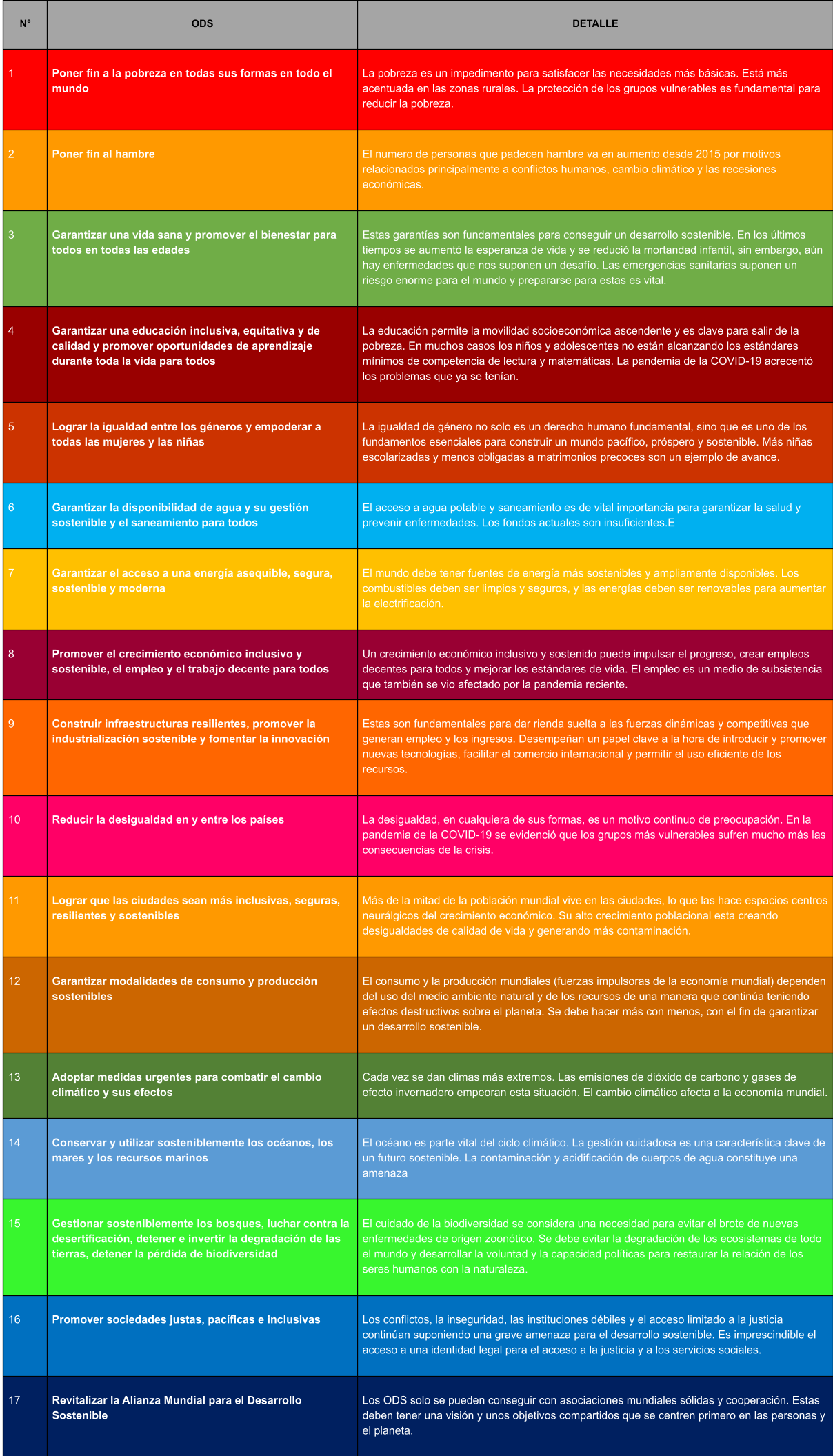 Los 17 ODS tienen un enfoque integral que les relaciona entre sí. Es por ello por lo que es muy importante el conocimiento básico de cada uno de los mismos. En el siguiente cuadro mostramos un pequeño detalle de cada uno de los ODS.