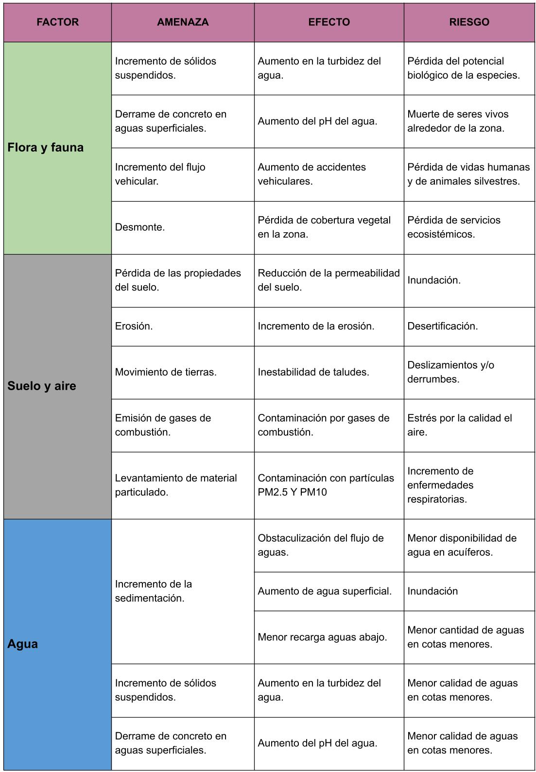 De acuerdo con la información anterior, podemos tener las siguientes amenazas junto a su nivel de riesgo sobre el medio ambiente: